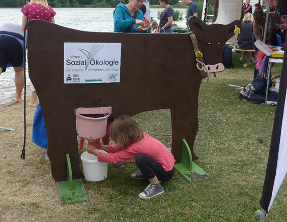 Das Melkeuter weckt direkte Assoziationen mit der Landwirtschaft und ist ein absoluter Hingucker für Infostände und Feste. Die Kuh eignet sich als Ergänzung zu Infotischen besonders zur regionalen Milchviehhaltung bzw. ökologischen Landwirtschaft.